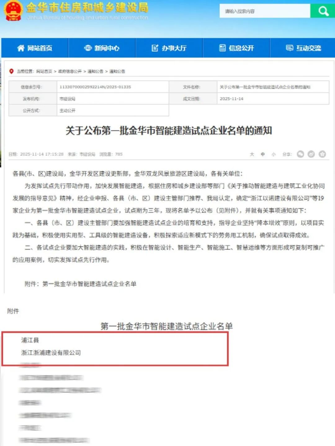 近日,金华市住房和城乡建设局公布了第一批智能建造试点企业及试点项目名单,集团所属浙江建工浙浦建设公司成功入选市级智能建造试点企业,成为浦江县唯一获此认定的建筑企业。