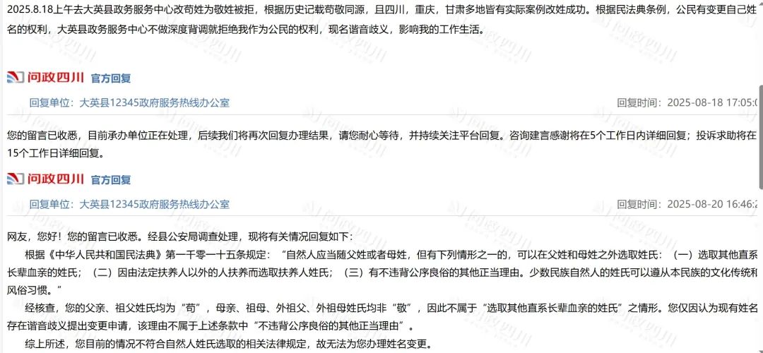 该网友对上述回复并不满意,并再次诉称,申请改为“敬”姓,不仅是谐音歧义,而是祖上本就姓“敬”,因历史原因改姓。太祖父已改为“敬”姓,自己只是申请恢复祖姓,改姓理由之一是谐音歧义。